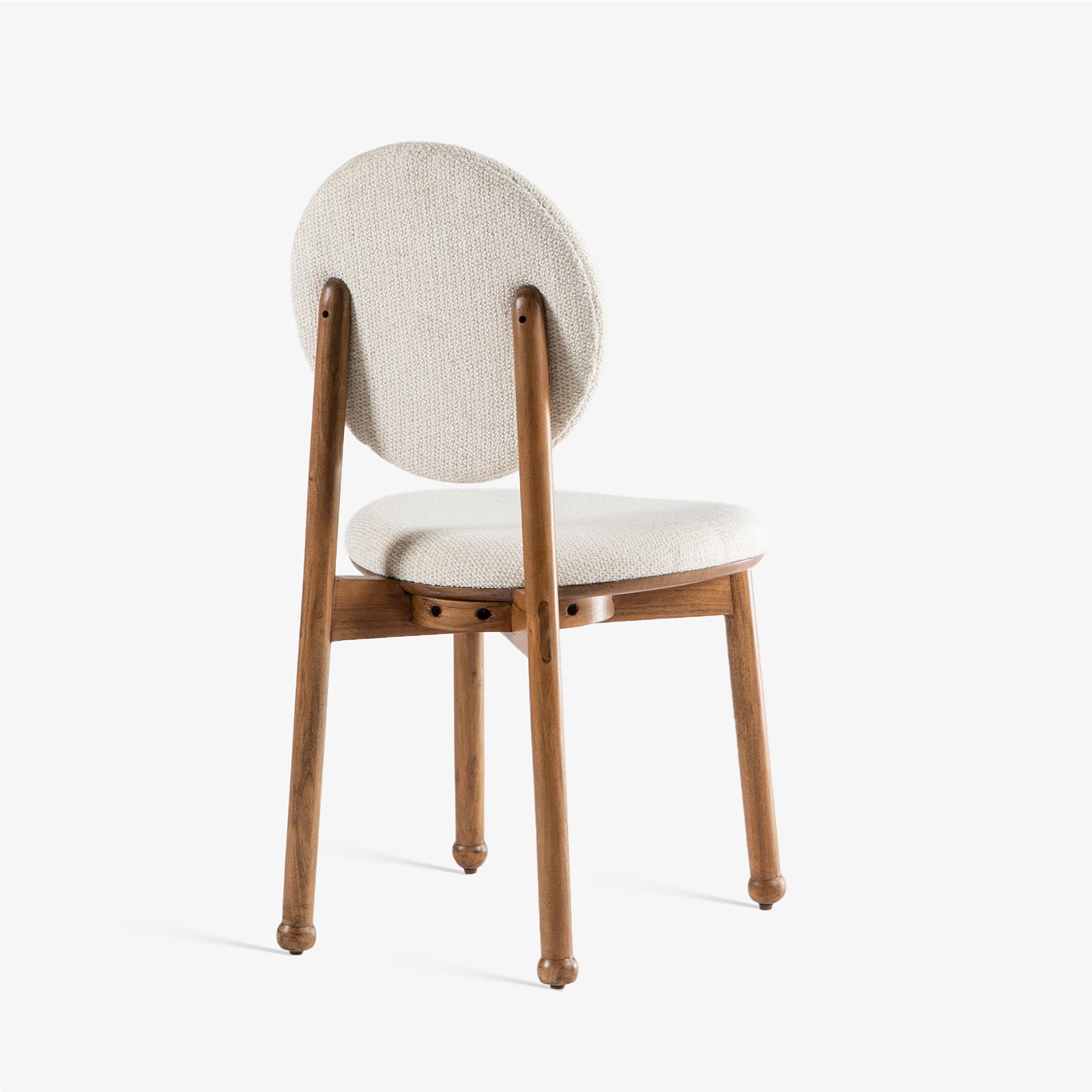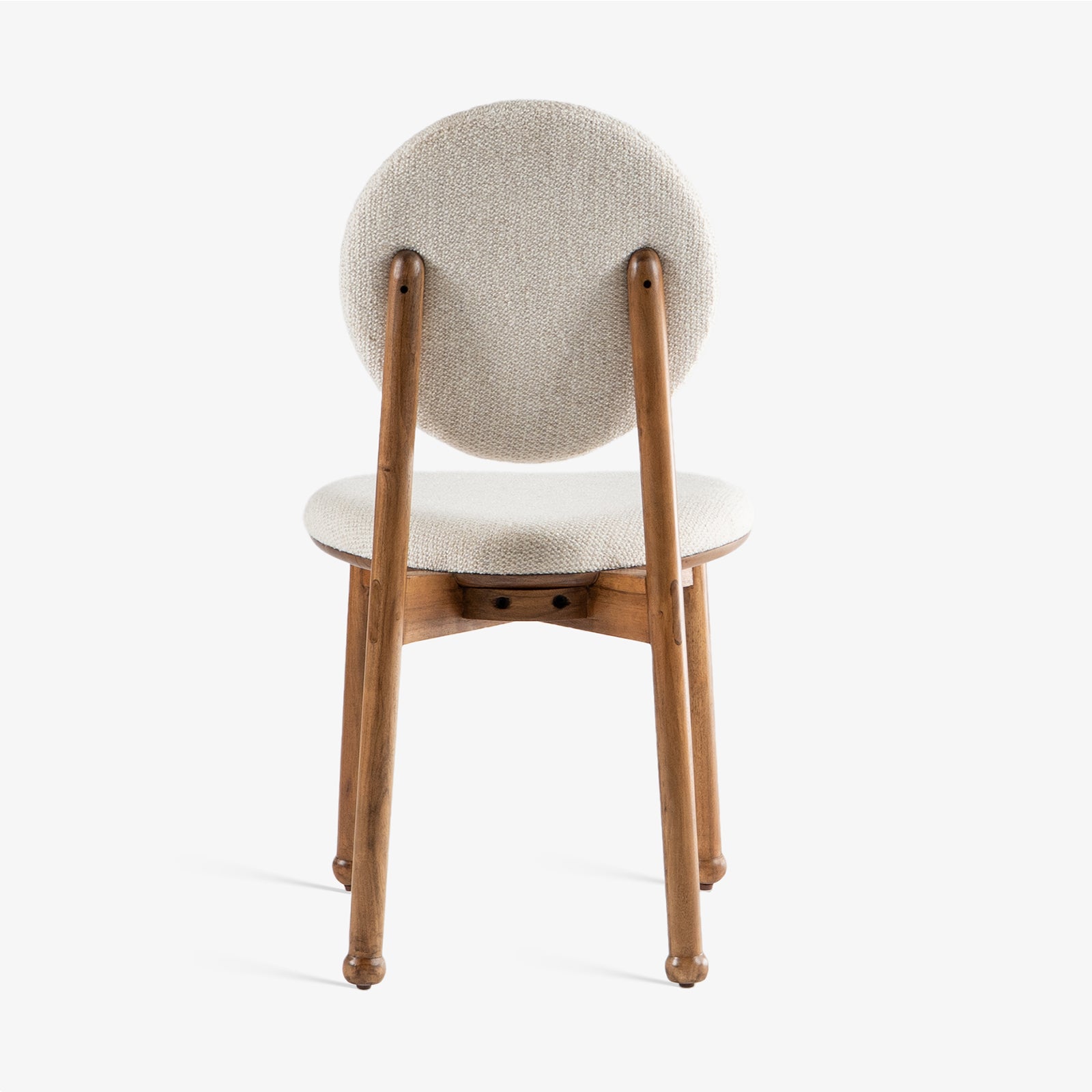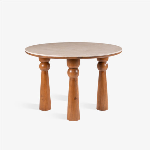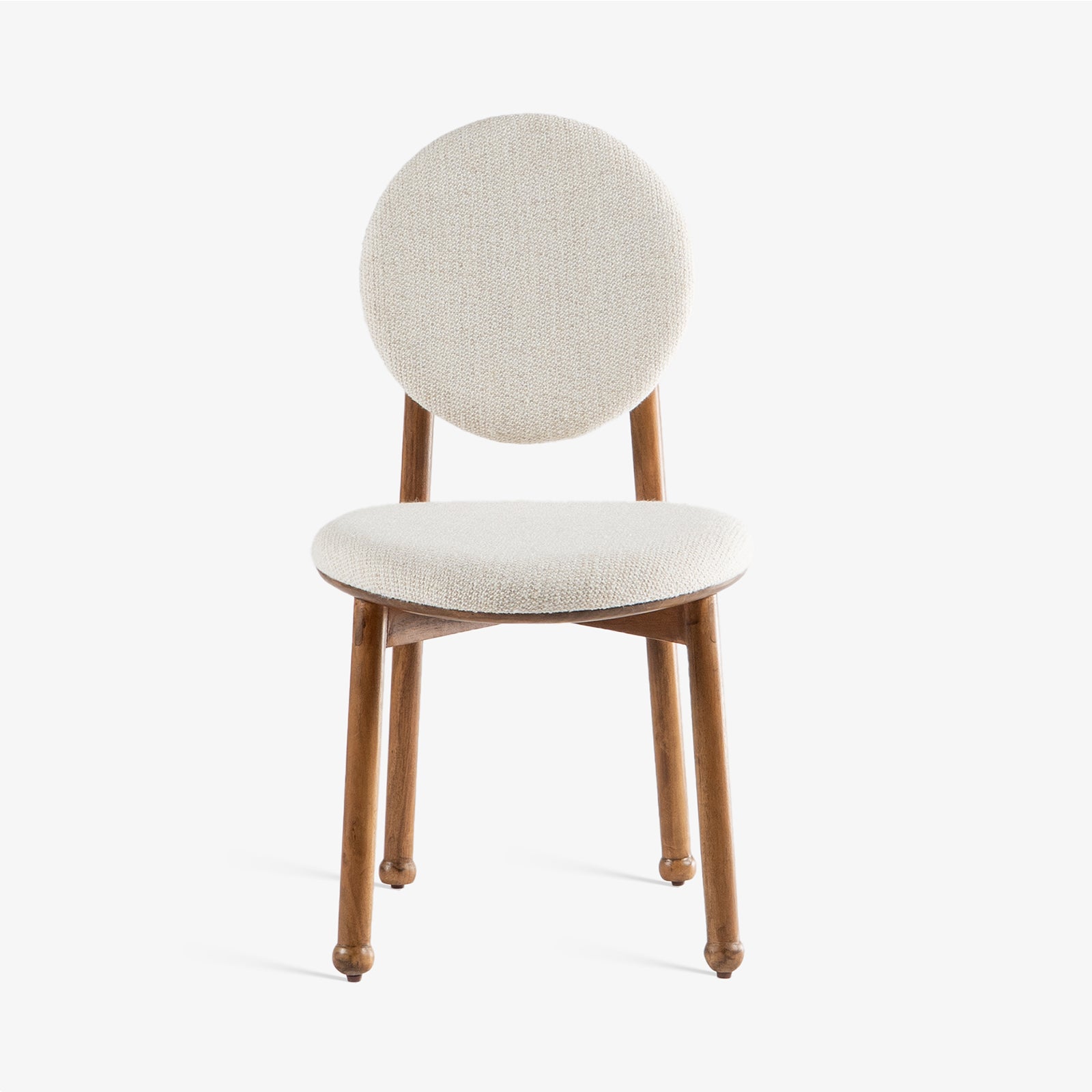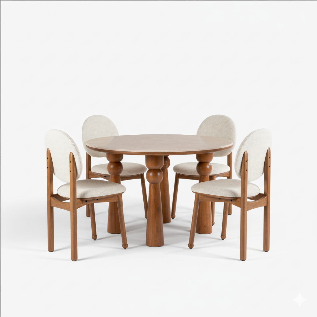 The Aayam Dining Set is a striking combination of sculptural design and inviting comfort, built around a shared aesthetic of playful modernity. The centerpiece table features a round Bottochino Marble top resting on distinctive, stacked-sphere and conical Acacia wood legs. This bold silhouette is perfectly complemented by the matching Aayam Dining Chairs, which feature charming circular upholstered backrests and generously cushioned seats for ultimate comfort. Finished throughout in a rich Teak Dark, this cohesive four-seater set creates a stylish and unforgettable statement in any dining space.