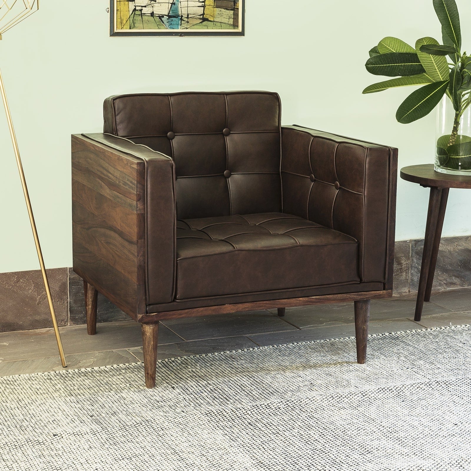 The Bicasso 1 Seater Sofa is a Sheesham wood marvel, boasting durability and elegance in an American walnut finish. Its plush brown cushion offers both support and comfort. Notably, it prioritizes safety, avoiding harmful chemical finishes for a natural, eco-conscious design.