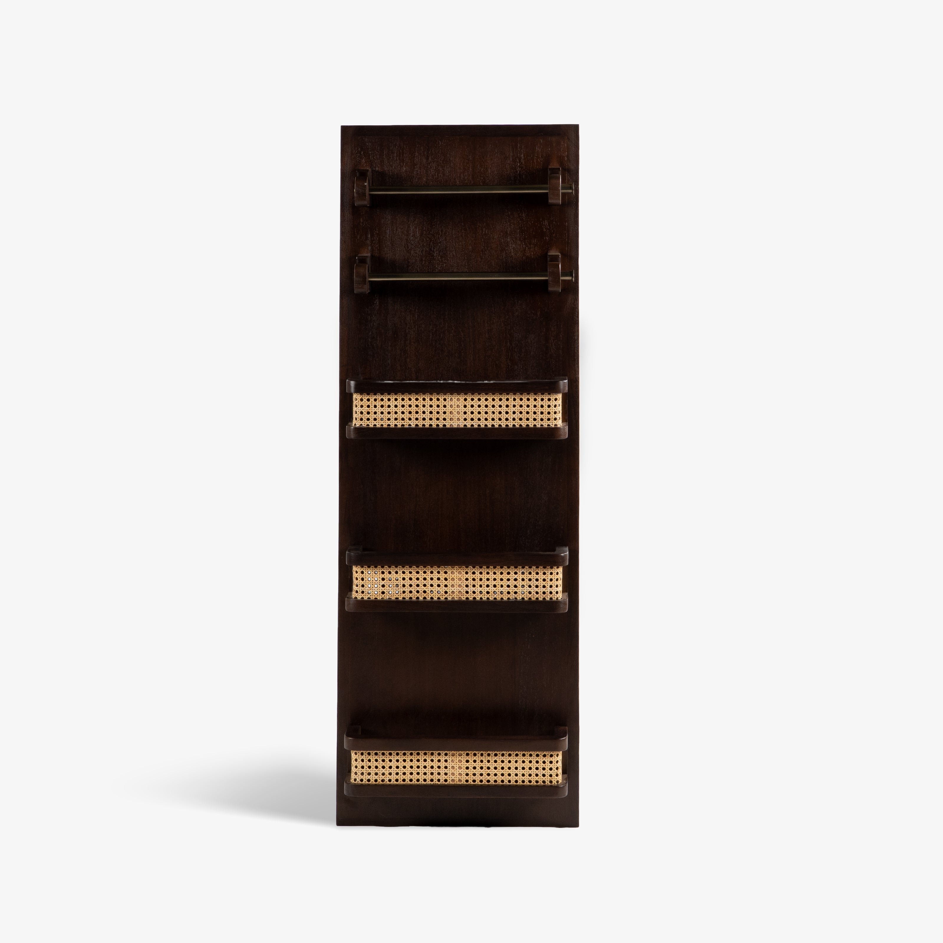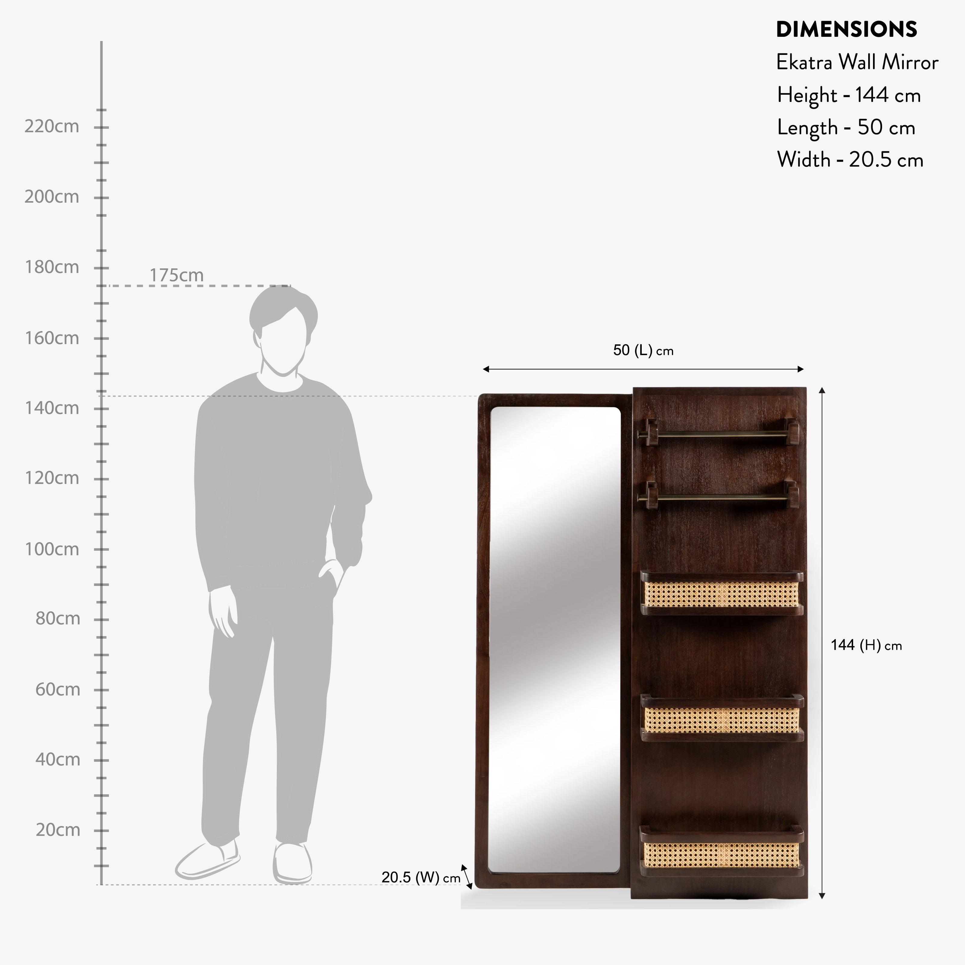 The Ekatra Wall Mirror is a multifunctional modular unit designed for modern, compact living. Featuring a full-length mirror framed in warm wood, integrated shelves, and grid hooks, it serves as both a dressing station and storage solution. Perfect for hallways, bedrooms, or studios, it blends elegance with everyday utility.