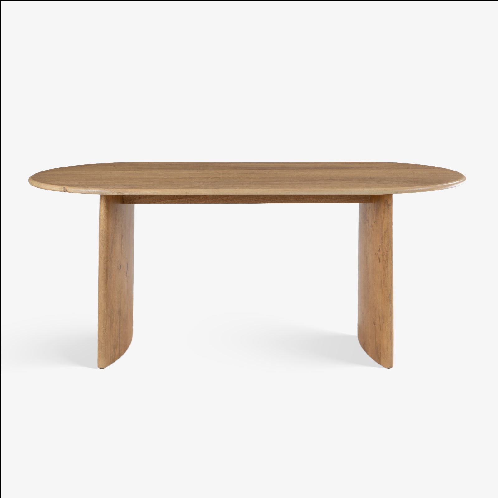 The Saanra Dining Set offers a blend of organic shape and architectural simplicity for the modern home. The Gahana Dining Table features a unique, organically-shaped Acacia wood top set upon two bold, curving pedestal bases accented with subtle brass detailing. This striking table is paired with the Akar Dining Chair, which emphasizes geometric comfort through its deep-cushioned, upholstered seat and backrest, supported by a distinct, clean-lined Acacia wood frame, all finished in a rich Kiara hue.